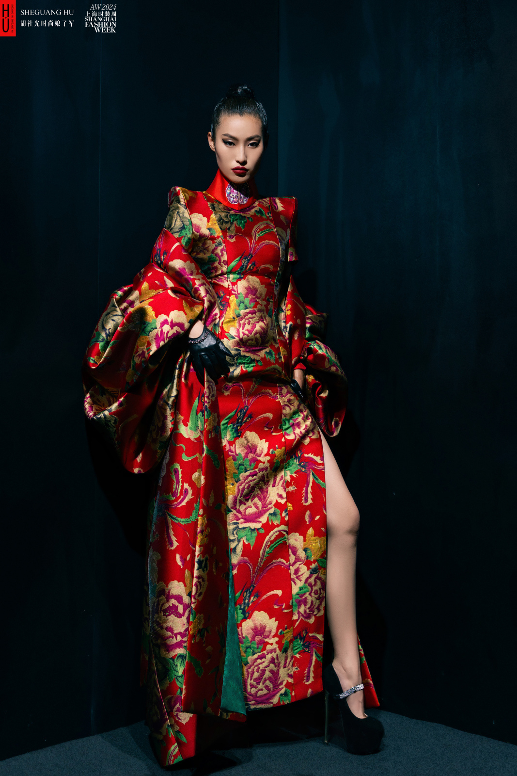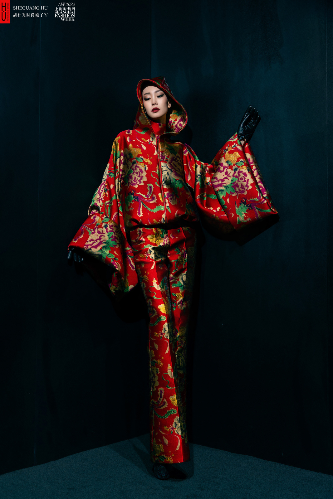 隨后,34位胡社光時尚娘子軍穿著“東北大花”套裝走上T臺,款式有西裝、旗袍、闊腿褲、風衣、斗篷、派克大衣、馬甲等,兼顧實際穿著的功能性。貝雷帽、圓形墨鏡、皮革手套、紅唇高靴……利用老上海十里洋場的“標配”,演繹出海派女子的鏗鏘。西式剪裁凸顯身材,模特渾身都是戲。