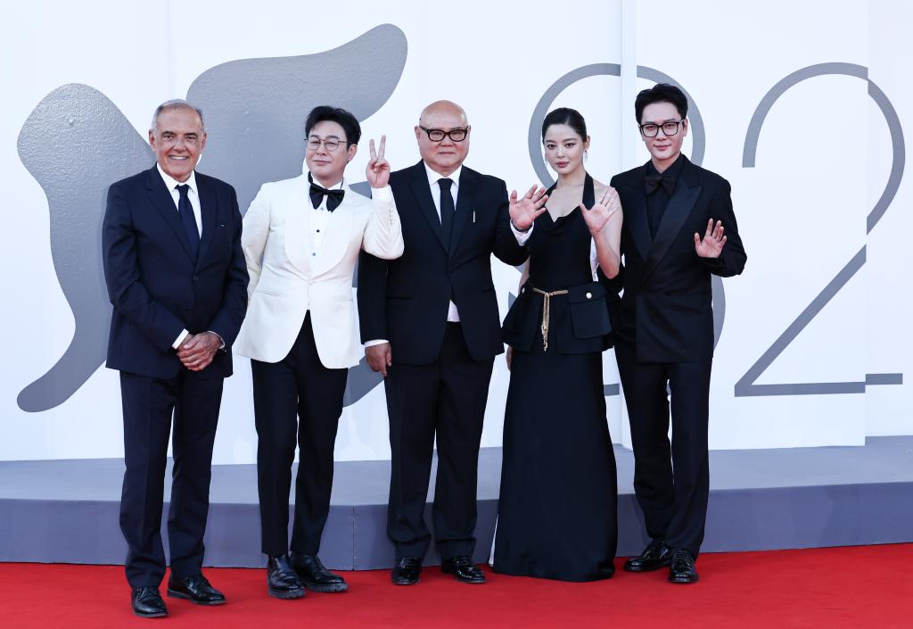 9月5日,在意大利威尼斯,電影《日掛中天》主創人員與威尼斯電影節主席阿爾貝托·巴爾貝拉(左一)出席首映式。新華社記者 李京 攝