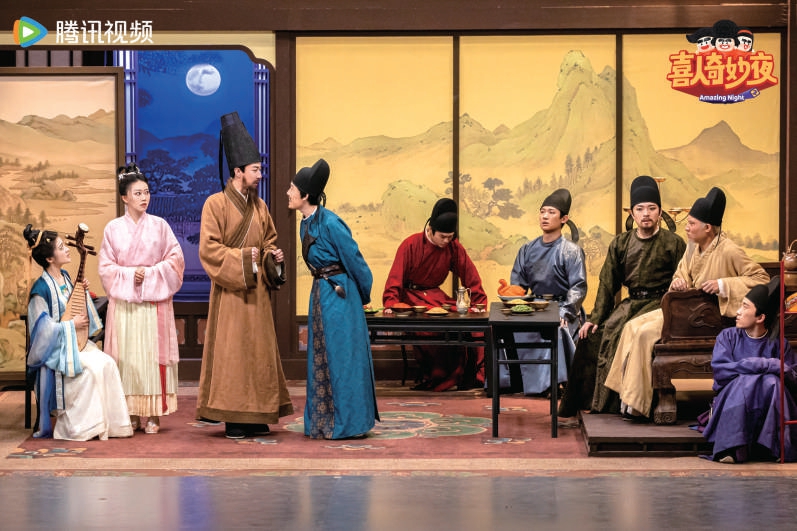 第五期節目中,一個場景引起了觀眾的注意:在作品《夜宴》落幕時,所有演員錯落站立,以姿態與神情復刻出了《韓熙載夜宴圖》。這個充滿儀式感與沖擊力的畫面不僅是一個作品的收官,也是一種創作理念的凸顯——群像喜劇,正以前所未有的質量與完成度在本季舞臺上大放異彩。