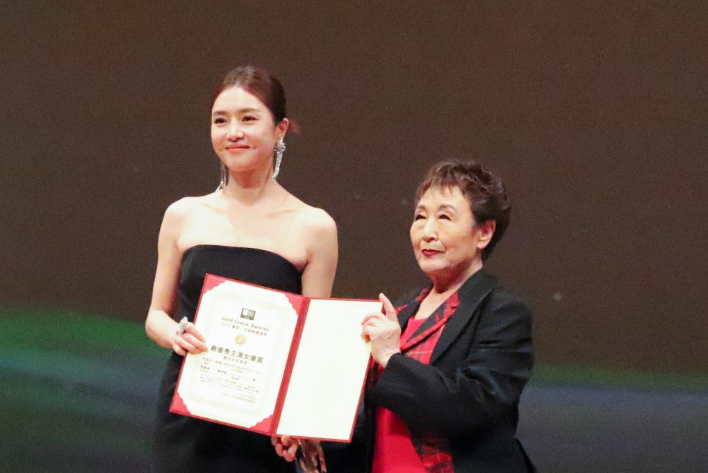 10月28日,在日本東京,演員曾夢雪(左)上臺領獎。曾夢雪憑借《分手清單》榮獲“金鶴獎”最佳女主角獎。新華社記者 李子越 攝