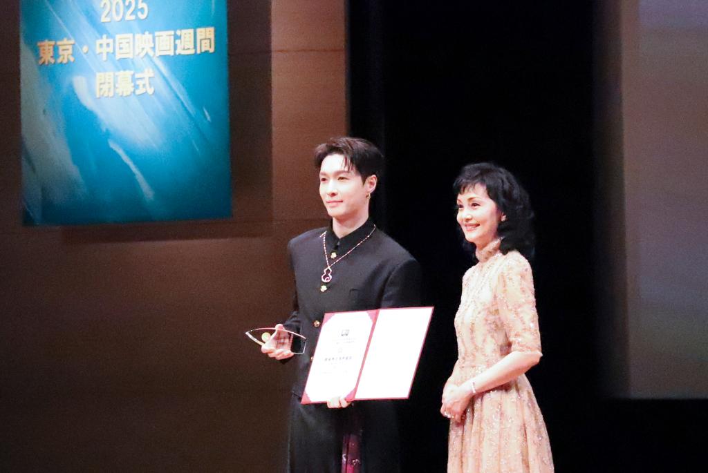 10月28日,在日本東京,演員張藝興(左)上臺領獎。張藝興憑借《不說話的愛》榮獲“金鶴獎”最佳男主角獎。新華社記者 李子越 攝