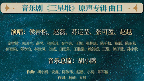 音樂劇《三星堆》發布原聲專輯,收錄原創音樂作品19首,由侯巖松、趙磊、蘇運瑩、張可盈、趙越、宗雪健、郭頌蘭、薛昱、張昕玥、秦立夫、千悅、張栩康等演員獻唱,最大化保留原汁原味舞臺魅力,再現古蜀與現代兩個時空交錯的戲劇張力。