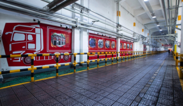 一汽解放卡車廠沖壓車間內的墻上卡車
