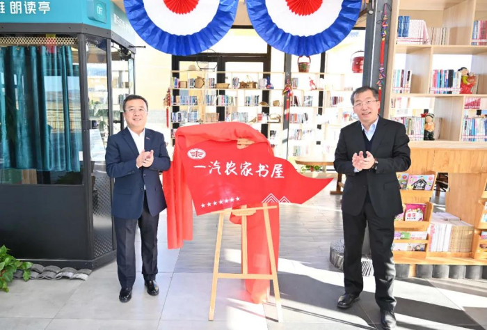 中國一汽董事、黨委副書記王國強為延安村“一汽農家書屋”揭牌