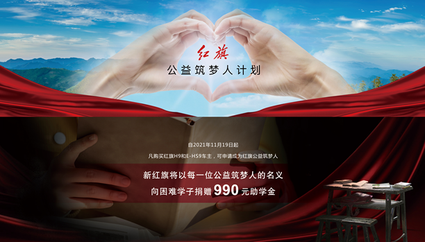2021年中國一汽更是推出了“紅旗公益筑夢人計劃”, 自2021年11月19日起,凡購買紅旗H9和E-HS9的車主,可申請成為“紅旗公益筑夢人”;新紅旗將以每一位公益筑夢人的名義,向困難學子捐贈990元助學金。