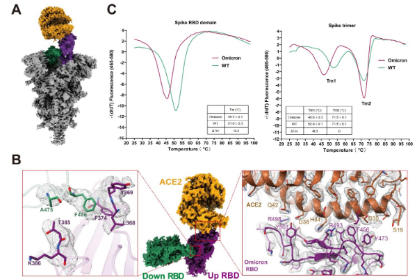 圖1 Omicron刺突蛋白結合人源受體ACE2的結構。A展示Omicron刺突蛋白結合人源ACE2結構的整體構象,B為RBD-RBD二聚體,以及RBD結合ACE2的相互作用界面,C為刺突蛋白的熱穩定結果。