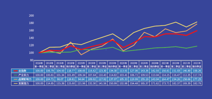 產業實力指數2021年比上年增長6.5%。2021年各季度中,第一、二季度分別同比增長10.0%上下;第三季度受新冠肺炎疫情影響企業停產停工,指數出現暫時性下降;仙游政府疫情防控與安全生產兩手抓,完善惠企政策、助力解決各種困難、推進產業互聯網融合及行業共享平臺建設,第四季度指數同比增長4.2%,達到基期以來的最好水平。