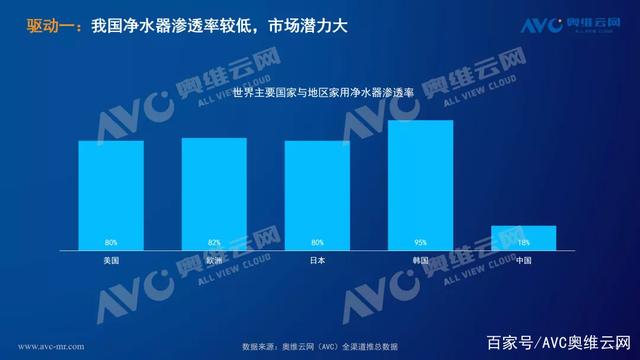 根據奧維云網2022年最新發布的數據顯示,我國凈水器品類百戶擁有量約為18.3臺,相比歐美國家70%以上的滲透率,我國依然有很大的市場增長潛力;成長起來的年輕消費群體也更愿意為品質生活和消費體驗買單。