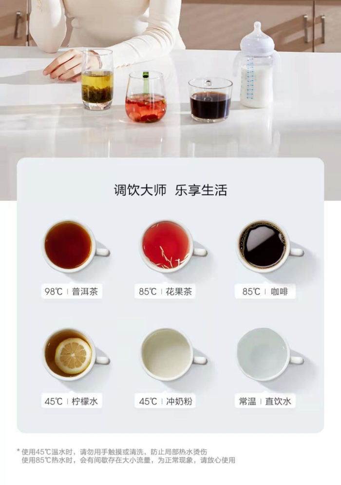 針對凈水器市場上傳統儲熱式凈水器不能即時選擇不同水溫的問題,添可飲萬智能凈水機能夠同時提供98℃、85℃、45℃和常溫四種水溫。作為添可飲萬最有競爭力的優勢之一,“冷熱溫水同時有”在大大提升飲水效率的同時,也極大地提升了全家人的居家舒適體驗。
