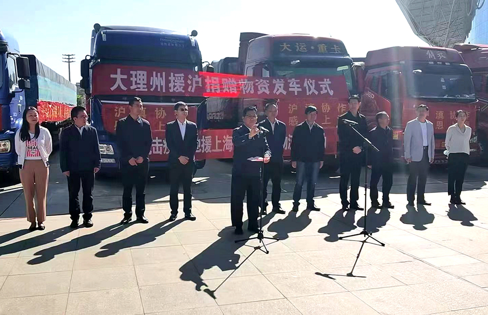 為積極幫助上海市打贏疫情防控攻堅戰提供物資支持,2022年4月23日上午,大理州政府在祥云縣舉行大理州援滬捐贈物資發車儀式。州領導李琰、吉向陽,州農業農村局、州鄉村振興局領導,大理市、祥云縣、賓川縣分管領導,及以云南東方紅生物科技有限公司為捐贈代表的企業紛紛出席。