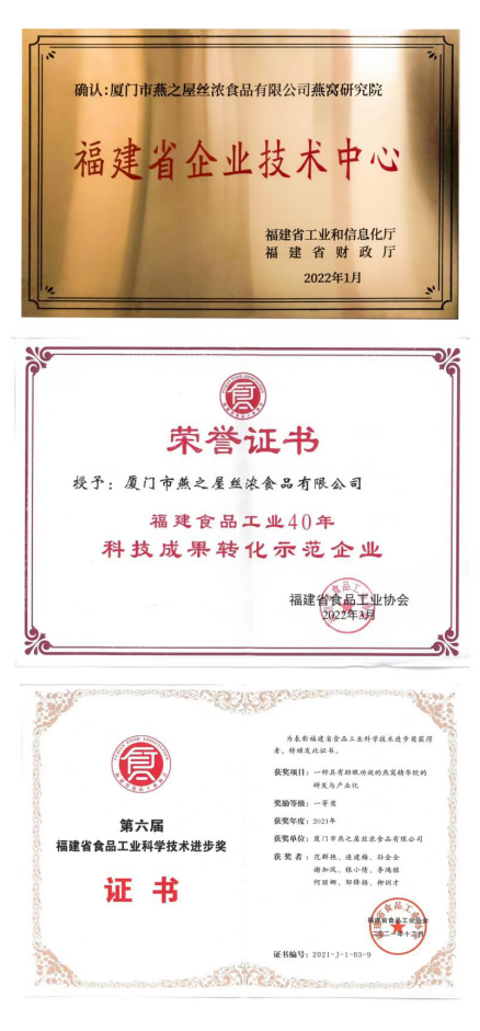 圖:燕之屋燕窩研究院獲批“福建省企業技術中心”稱號、燕之屋獲“福建食品工業40年科技成果轉化示范企業”等榮譽