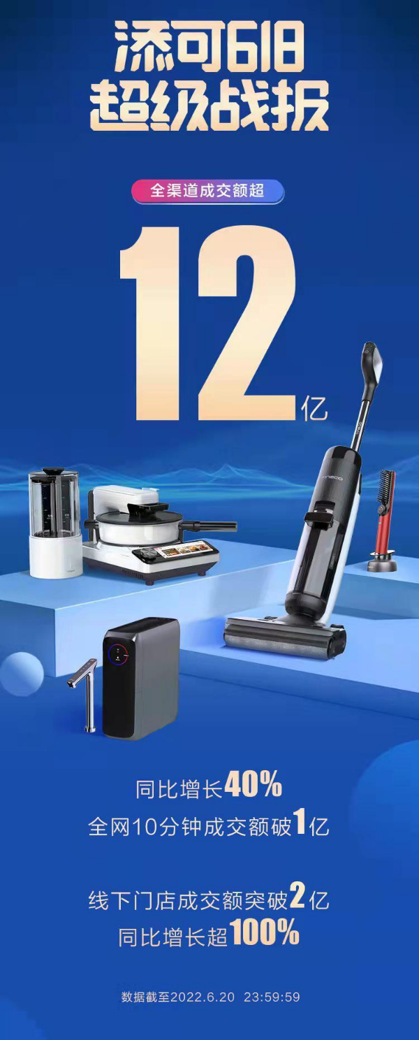 上半年即將結束,618成為各大品牌上半年沖擊業績的最后一次機會。在激烈的競爭態勢下,高端智能家電品牌添可成績亮眼。618首日,添可線上成交額突破4億,銷售額同比增長41%。正式開售僅10分鐘,即破1億元。截止到6月20日,添可全渠道銷售額已突破12億,同比增長40%。線下門店成交額突破2億,同比增長超100%。