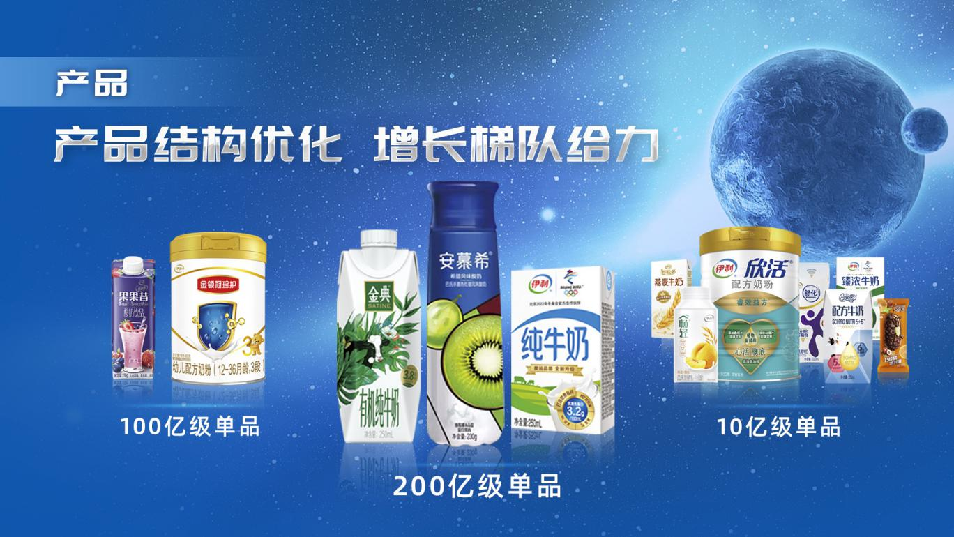 如今,伊利已擁有“伊利”母品牌及20余個子品牌,其中伊利、安慕希、金典年銷售收入200億元以上,金領冠、優酸乳年銷售收入100億元以上,舒化、暢輕、巧樂茲等10個子品牌年銷售收入10億元以上,每年有13億消費者選擇伊利,穩居消費者“首選品牌”。依托層出不窮的創新產品,伊利在滿足市場不斷升級的健康需求的同時,推動經營業績持續增長,2021年公司實現營業總收入1105.95億元,成為亞洲首個跨千億乳企。