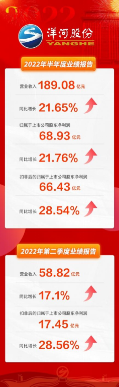 8月26日,洋河股份披露2022年半年報。營業收入189.08億元,同比增加21.65%;上半年歸屬于上市公司股東的凈利潤68.93億元,同比增加21.76%;歸屬于上市公司股東的扣除非經常性損益的凈利潤66.43億元,同比增長28.54%。
