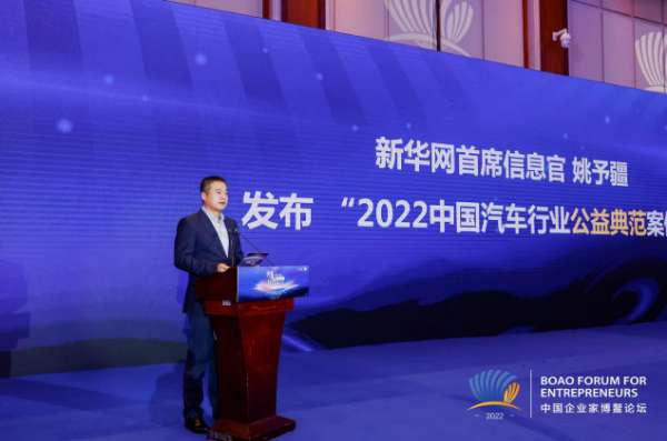 新華網首席信息官姚予疆發布“2022中國汽車行業公益典范優秀案例”,中國一汽、東風集團、豐田中國、北京現代入選。