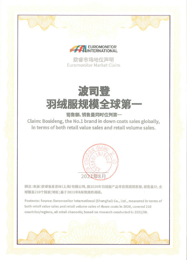 2021年,波司登首次入選國際五大品牌價值評估權威機構之一Brand Finance 公布的“2021全球最具價值服飾品牌排行榜50強(Brand Finance Apparel 50 2021)”。2022年波司登再次入選該榜單,品牌全球價值不斷提升。2021年8月,世界權威市場調查機構歐睿國際發布了2020年全球羽絨服調研報告,根據報告顯示,波司登羽絨服的銷售額、銷售量同時位列全球第一。波司登不僅向世界展示了品牌卓越潛力與魅力,更為中國服裝品牌爭取了更多國際話語權。