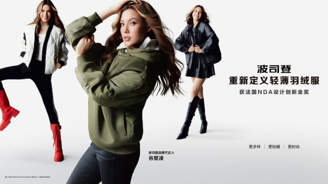 2022年,波司登重新定義輕薄羽絨服,推出“更多樣、更輕暖、更時尚”的產品,通過羽絨跨界百年時尚單品、獨創式羽絨拼接、藝術化絎線設計,擺脫傳統輕暖羽絨服款式重復單一、美感與保暖難以兼具的現狀,實現輕薄羽絨服品類的首次顛覆式創新。除了三大創新設計,波司登新一代輕薄羽絨服還融合了五大輕暖科技——創新性多層保溫空氣層面料、超輕裸膚面料、國際認證優質鵝絨、德國防鉆絨技術以及智能防寒工藝,攻克了一系列難題,全面提升產品質感、質量,讓消費者享受更加卓越的產品。