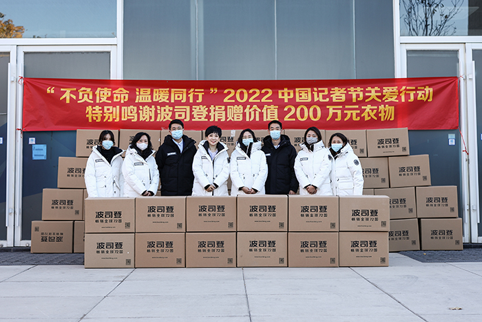 11月7日,在第23個中國記者節到來之際,由中華全國新聞工作者協會(又稱中國記協)指導,新華網主辦的“不負使命 溫暖同行”2022中國記者節關愛行動在北京舉辦。在此次活動中,波司登向中國駐外記者贈送了價值200萬元羽絨服物資,以致敬每一位新聞工作者,用愛傳遞溫暖。