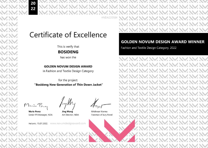 設計與科技的雙重革新,體現出波司登在羽絨服行業的實力,重新定義輕薄羽絨服獲得“全球十大設計創新金獎”——法國NDA設計大獎。