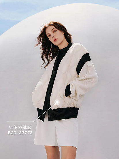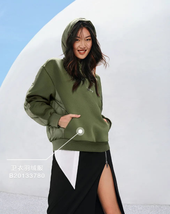 設計中,突出亮點之一是新元素的融入,波司登汲取了經典時尚單品衛衣及針織的元素靈感,將其與羽絨無縫結合,實現功能性與設計感的統一。這一操作突破了羽絨服設計的傳統框架,在單一畫卷上進行創意“涂鴉”,使羽絨服擁有跨越場景、跨越季節的能力。