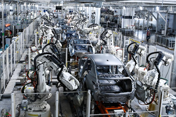 在吉林長春中國第一汽車集團有限公司紅旗繁榮工廠焊裝車間內,焊裝機器人在生產線上焊接車身。新華社記者 顏麟蘊 攝