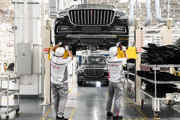 工人在位于吉林長春的一汽紅旗工廠總裝車間內裝配車輛。 新華社記者 顏麟蘊 攝