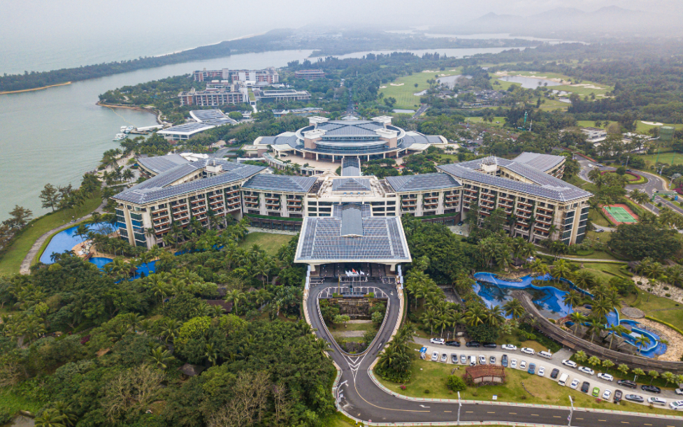 博鰲亞洲論壇國際會議中心和博鰲亞洲論壇大酒店(3月9日攝,無人機照片)。新華社記者 蒲曉旭