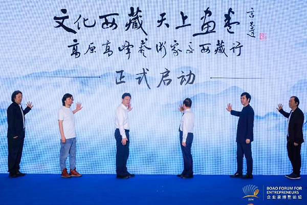 接下來,進入了本次論壇最重要的環節——“文化西藏天上畫卷·高原高峰藝術家西藏行項目”啟動儀式。新華網股份有限公司黨委書記、董事長儲學軍,西藏自治區文化和旅游廳黨組成員、副廳長石玉輝,西藏自治區美術家協會名譽主席唐天源,中國文藝志愿者協會副主席、中國美術家協會理事、中國國家畫院美術館原館長何加林,中國美術家協會理事、中國文聯美術藝術中心原主任丁杰,中國美術家協會中國畫藝委會委員、福建省美術家協會副主席兼山水畫藝委會主任梁明作為代表,共同上臺一起啟動了“文化西藏天上畫卷·高原高峰藝術家西藏行項目”。