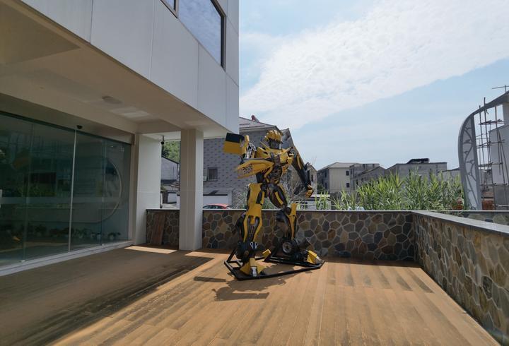 美在錯愕中:在余村的“共富后巷”,在一排鄉村別墅前,突然矗立著一個汽車機器人——大黃蜂,仿佛在看家護院,細看才知是浙大的機器人研學基地。