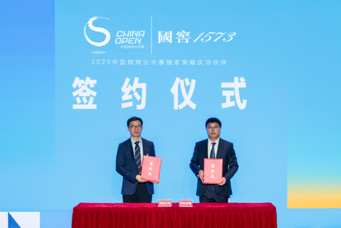 發布會現場,瀘州老窖與中網舉行簽約儀式,中網公司黨支部書記、總經理李旭華與瀘州老窖股份有限公司副總經理趙丙坤共同簽署合作協議,國窖1573將作為中國網球公開賽獨家榮耀慶功伙伴為球員加油喝彩、為勝利時刻干杯。