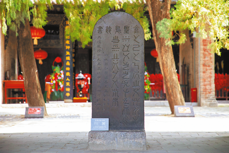 10月13日,記者踏上這片圣地,只見倉頡廟高垣厚墻,格局完整。整組建筑自南向北,依次分別為照壁、山門、前殿、報廳、中殿、后殿、倉頡墓。殿內珍藏的18通古碑,是鐫刻歷史的“石質史書”。其中,《倉圣鳥跡書碑》上鐫刻的28個象形文字,是當年倉頡所造形象文字的原形,被海內外學者稱為“中華民族第一篇史書”?!稄V武將軍碑》為前秦建元四年(公元368年)所立,碑文書法流暢,高渾飄逸,康有為贊此碑為:“古雅第一,關中楷隸冠”。
