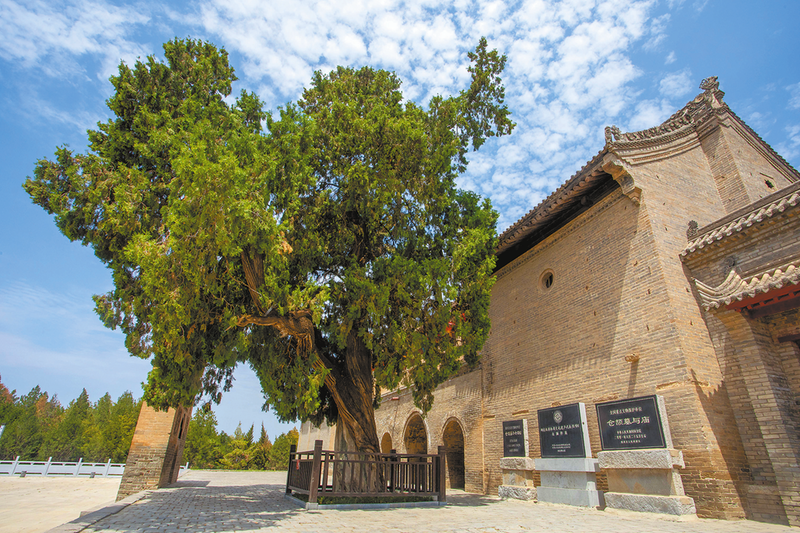 倉頡廟里,46棵千年古柏構成了與山東曲阜孔廟古柏群、陜西延安橋山黃帝陵古柏群并稱的中國三大古柏群,堪稱“活著的文物”。其中最負盛名的“倉頡手植柏”距今已有5000余年歷史,是全國僅存5棵5000年以上古樹名木之一。而“柏抱槐”的奇觀更是令人稱絕,古柏樹身中生出國槐,柏槐共生,相依相擁,被納入全國百棵名樹之列。