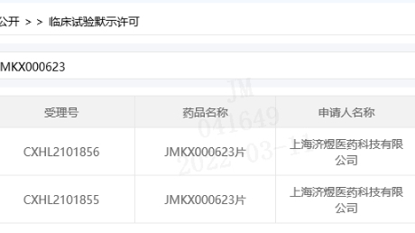 2022年3月12日,濟民可信集團在上海宣布,旗下子公司上海濟煜醫藥科技有限公司自主研發的高選擇性離子通道阻滯劑JMKX000623新藥臨床試驗申請(IND)已獲得中國國家藥監局藥品審評中心(CDE)批準。