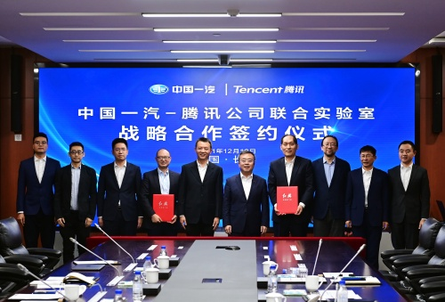 中國一汽集團公司董事、黨委副書記王國強,騰訊公司副總裁、騰訊智慧交通和出行總裁鐘翔平出席戰略合作協議簽約儀式。