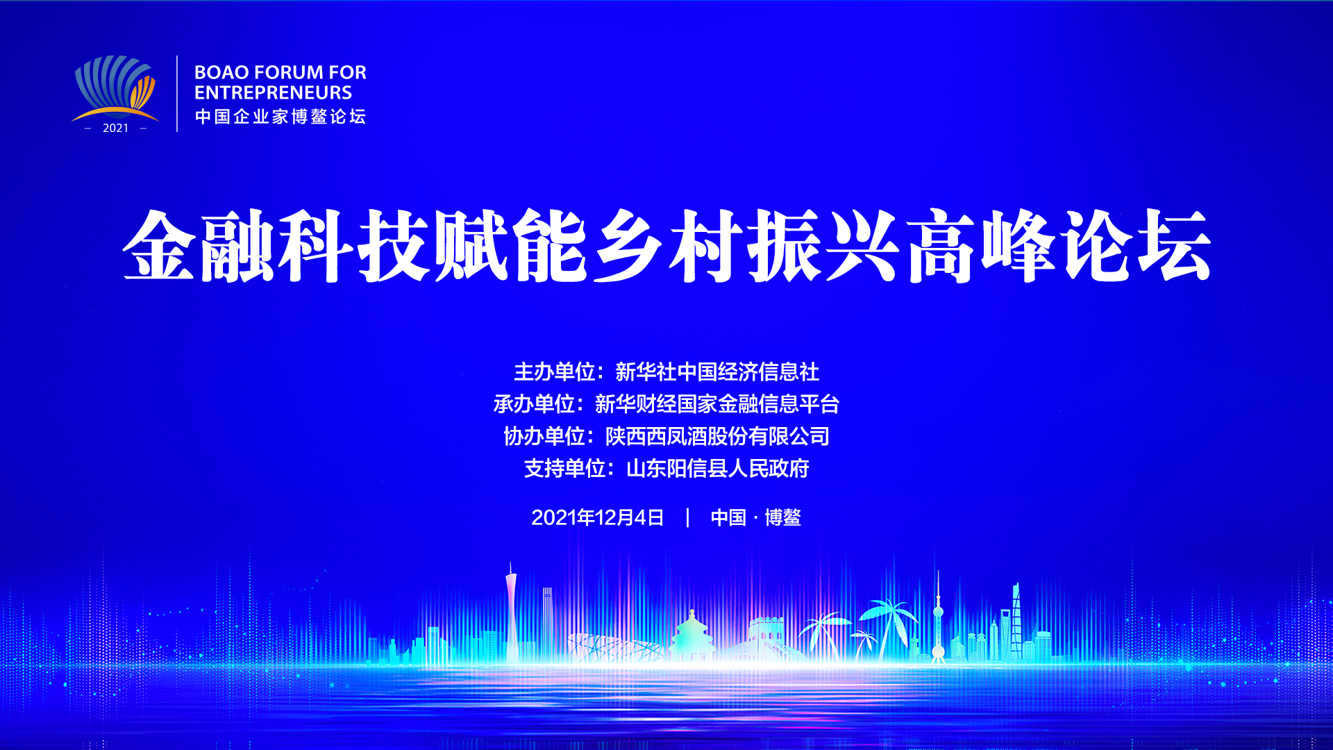 2021年是“十四五”開局之年,是實施鄉村振興戰略的發力之年。為發揮金融科技的技術、渠道等優勢,撬動更多社會資源投入到鄉村振興偉大事業,中國經濟信息社在2021中國企業家博鰲論壇期間,于12月4日下午舉辦金融科技賦能鄉村振興高峰論壇,邀請相關主管部門領導、專家學者、企業高管等嘉賓,共同探討金融科技賦能鄉村振興路徑,共話鄉村振興新機遇、新模式、新思路,全面助力鄉村振興。本屆論壇由陜西西鳳酒股份有限公司協辦,山東陽信縣人民政府支持。