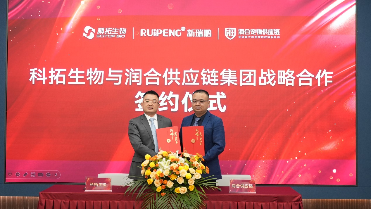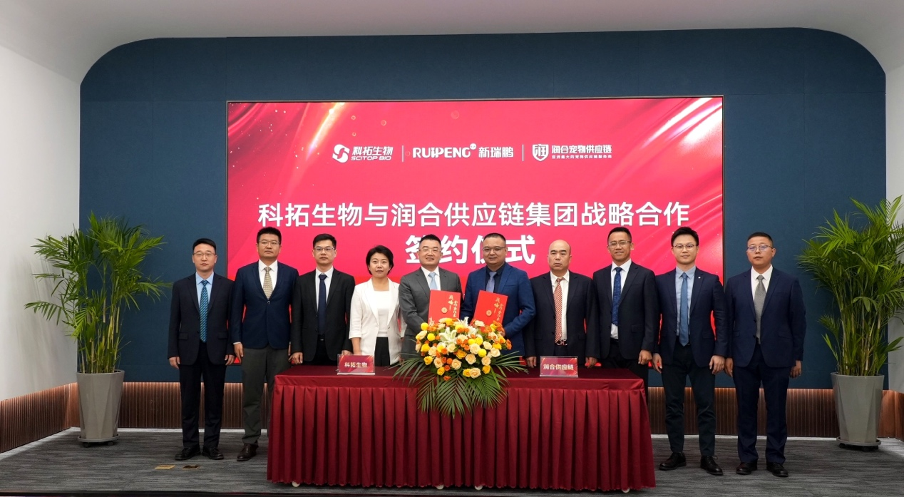 8月2日,科拓生物與新瑞鵬旗下潤合供應鏈集團在呼和浩特簽署5億規模戰略合作協議??仆厣锟偛脛攒?,內蒙古和林格爾新區黨工委委員、管委會副主任高晉,以及新瑞鵬集團副總裁兼潤合供應鏈集團總經理李萬邦出席會議并簽署戰略合作協議。此次合作標志著科拓生物在寵物健康領域的又一重要布局,也充分體現了雙方對寵物健康產業未來發展的高度認同。