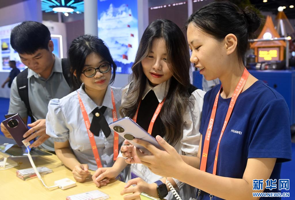 9月28日,在廣西南寧國際會展中心,參展人員(右一)向觀眾推介手機產品。
