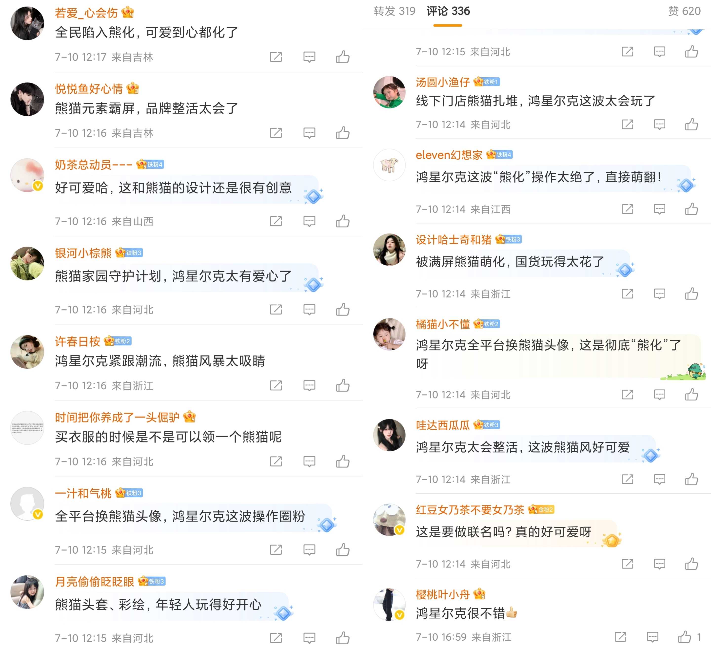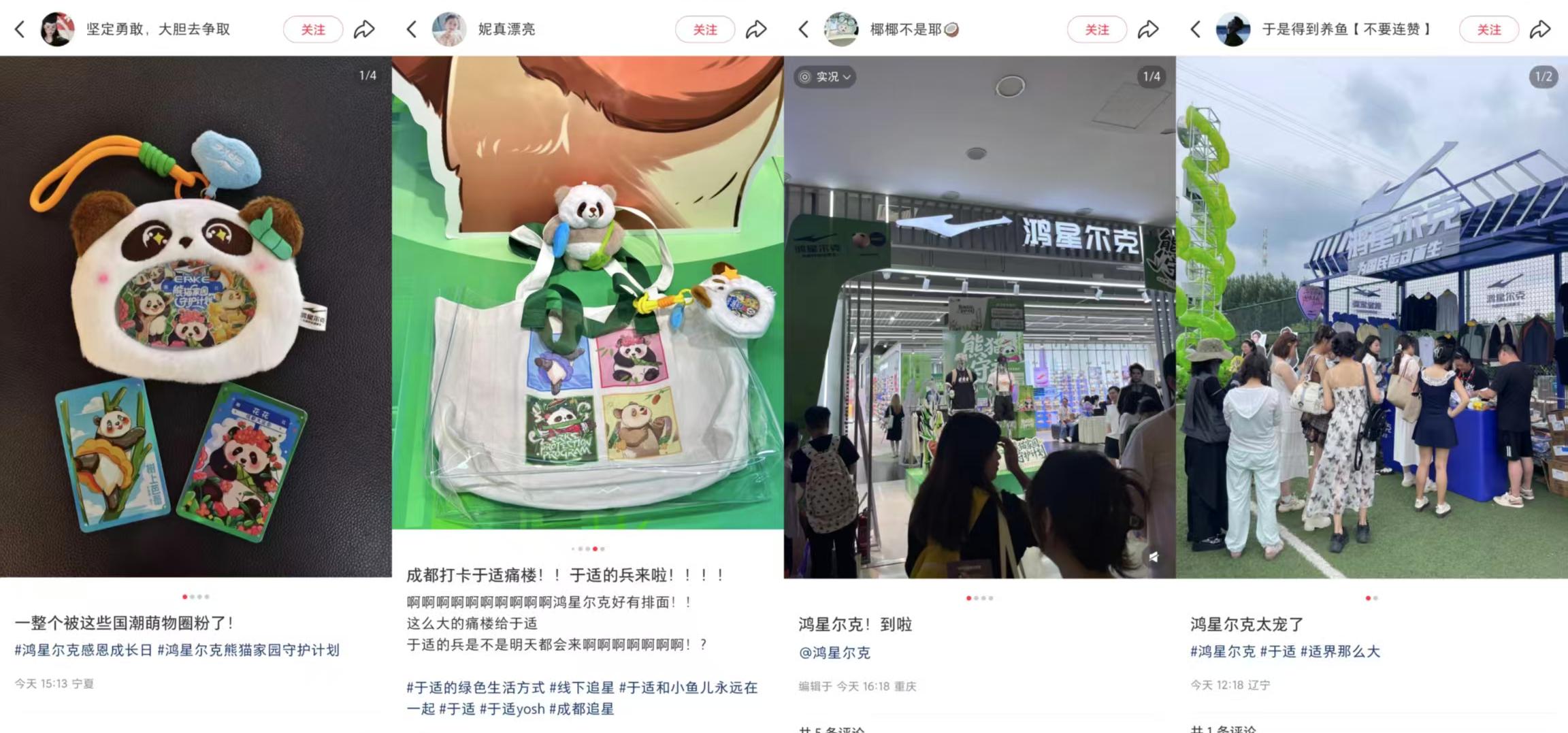 “鴻星爾克‘熊化’了,好可愛!”“熊貓花花為自己T恤代言了,必須支持!”“國民品牌和國寶的聯名!”“熊貓很可愛,痛包很搶手,爾克很擔當!”“熊貓t速速補貨”……在微博、抖音、小紅書等社交平臺上,不少消費者分享了鴻星爾克最新熊貓T和周邊,用實際行動共同守護熊貓。