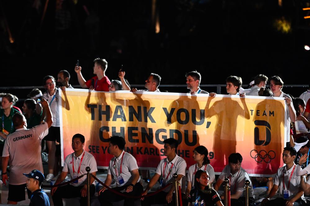 成都世運會推廣歌曲《逐夢》響起,國際世界運動會協會會旗緩緩降下,標志著“成都時間”即將畫上句點。成都市市長王鳳朝將會旗鄭重交予佩魯雷納,繼而傳遞給下一屆舉辦城市德國卡爾斯魯厄市市長弗蘭克·門特魯普。