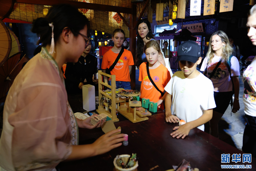 當夜幕降臨,選手們的腳步邁向了邯鄲道——這條被稱為“邯鄲文旅生命線”的歷史文化街區。在這里他們觸摸方言文化?!啊喜毁嚒鞘裁匆馑??”來自津巴布韋的楊靖指著墻上的方言牌,滿臉好奇。當得知這是邯鄲人夸贊“做得好、很棒”的日常用語時,他立刻對著同行的越南小伙伴試了一句,逗得對方哈哈大笑。古道旁的閣樓上,經典劇目《將相和》正在上演,當藺相如“負荊請罪”的一幕出現時,選手們紛紛舉起手機記錄,有人還小聲跟著臺詞默念。演出結束后,選手們用熟練的中文與表演者們進行了友好交流。網絡達人薩沙和媽媽維多利亞走在街區,被眼尖的游客認出,大家圍上來用中文打招呼,薩沙順勢用流利的漢語分享自己對“和為貴”的理解,瞬間拉近了陌生人之間的距離。