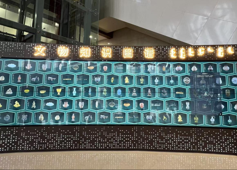 走進內蒙古博物院,一層大廳左手邊的“文物知識圖譜”墻便可作為游客了解博物館的入口,通過觸摸屏互動展示重點文物信息,系統以三維模型和高清圖片形式呈現文物,游客可放大查看細節圖案,了解文物間的邏輯關系網絡,還可以掃描二維碼,導航至實體展品位置。