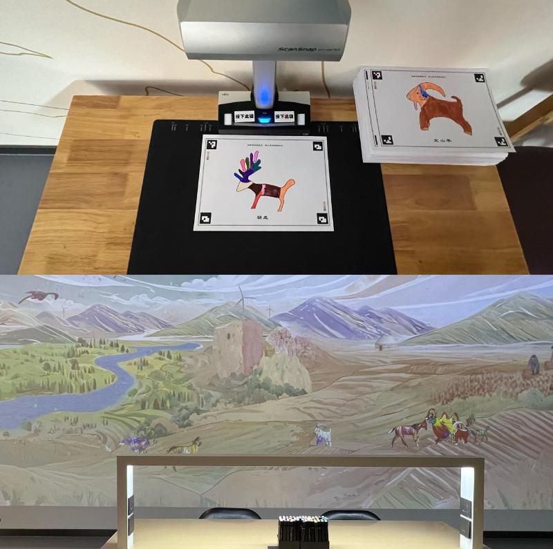 圖為內蒙古博物院N探空間“靈感創作區”的黑白填涂活動,游客可將填涂后的作品掃描(上圖),“映”到北疆圖軸上(下圖)。新華網 李世純 攝
