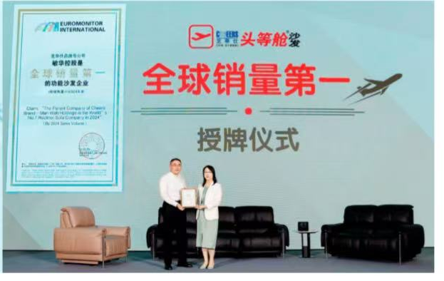 活動中,歐睿國際亞太區高級總裁穆愔女士為芝華仕品牌母公司敏華控股頒發了歐睿國際認證的2024年度全球銷量第一的功能沙發企業證書。