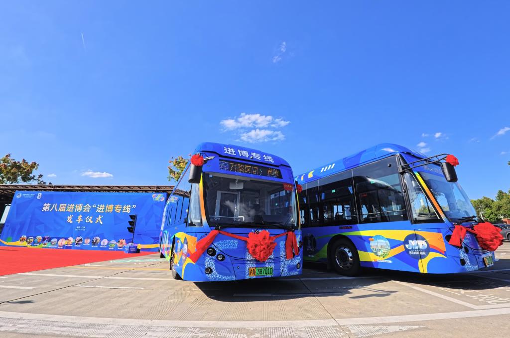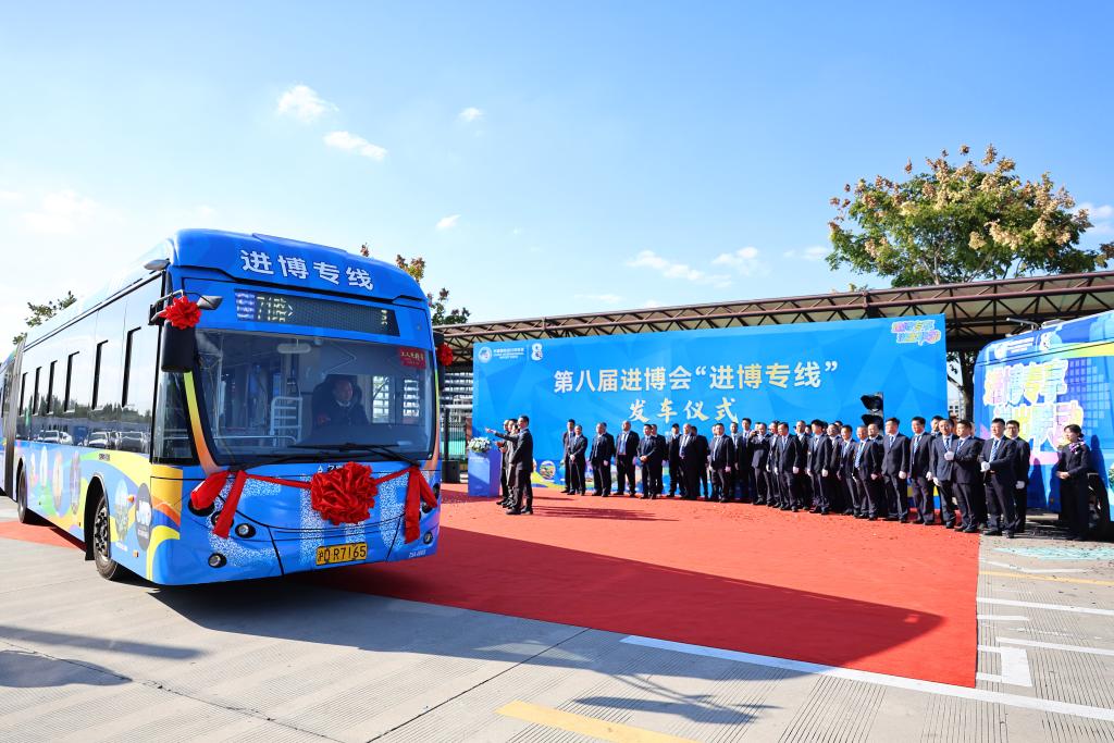 10月29日,第八屆進博會“進博專線”發車儀式在上海舉行。8輛“進博專線”車采用以“進博藍”為主色調的彩色車衣設計,除了為展客商提供從外灘到國家會展中心(上海)往返交通便利外,還將巡游于市中心區域,串聯起淮海路、靜安寺、徐家匯、北外灘等熱門商圈。第八屆進博會“進博專線”于11月1日至30日全月運行。