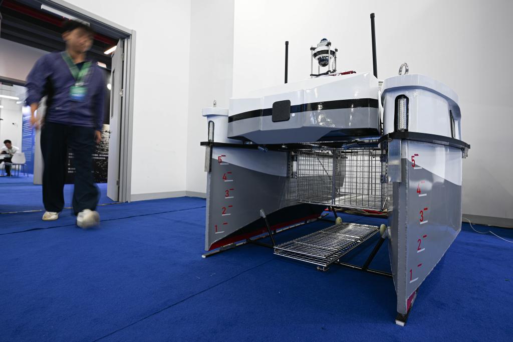 10月29日在深海先進技術及裝備成果展上拍攝的智能巡航水面保潔無人船。