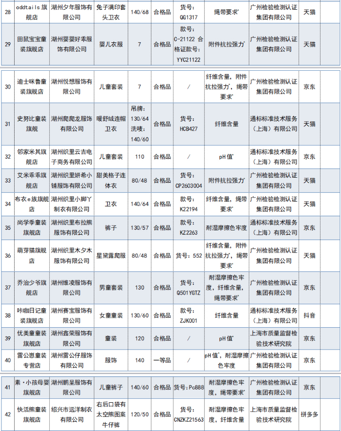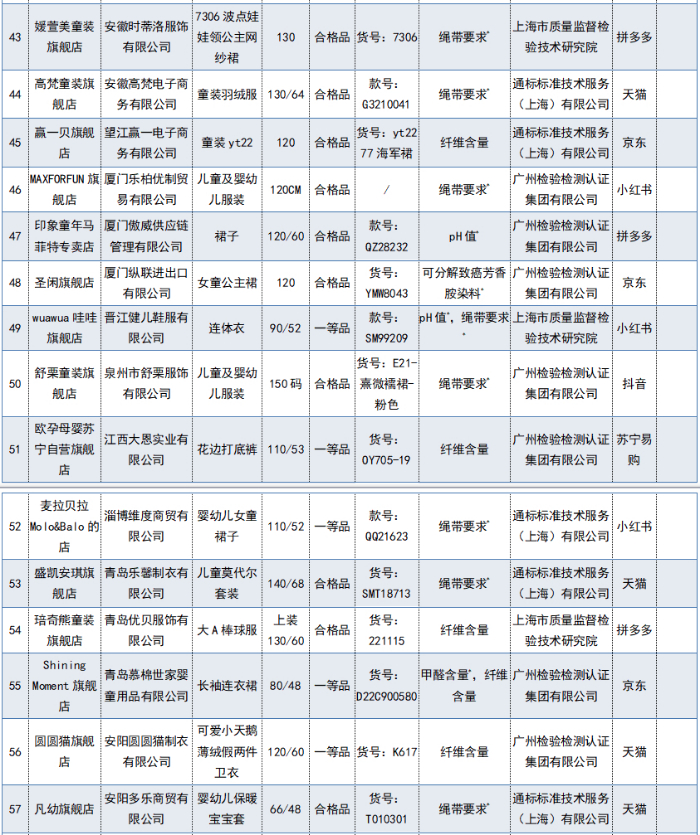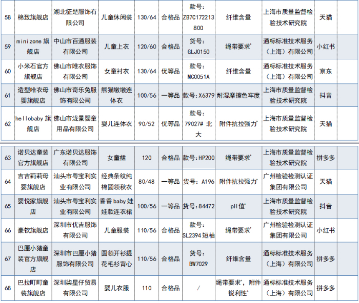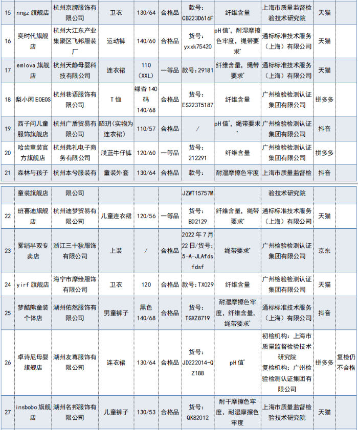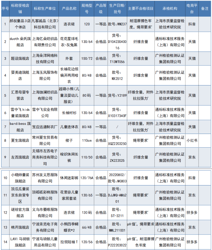 2022年網售兒童及嬰幼兒服裝質量國家監督抽查不合格產品及企業名單