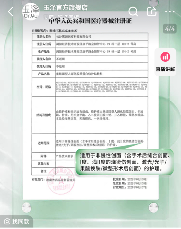 針對輕醫美后引發的皮膚問題,品牌瞄準消費者需求,推出醫用敷料產品。據悉,醫用敷料歸屬二類醫療器械產品,不同于日常護膚所使用的普通面膜,需得到國家藥監局的批準注冊,完成管理備案。醫用敷料在功效上需具有治療和輔助治療的作用。如可復美重組膠原蛋白敷料宣稱適用于尋常性痤瘡、皮炎、敏感性肌膚、激光治療術后,玉澤重組三型人源化膠原蛋白修護貼敷料宣稱適用于非慢性創面(含手術后縫合創面、一度、淺二度的燒燙傷創面、激光/光子/果酸換膚/微整形術后創面)。