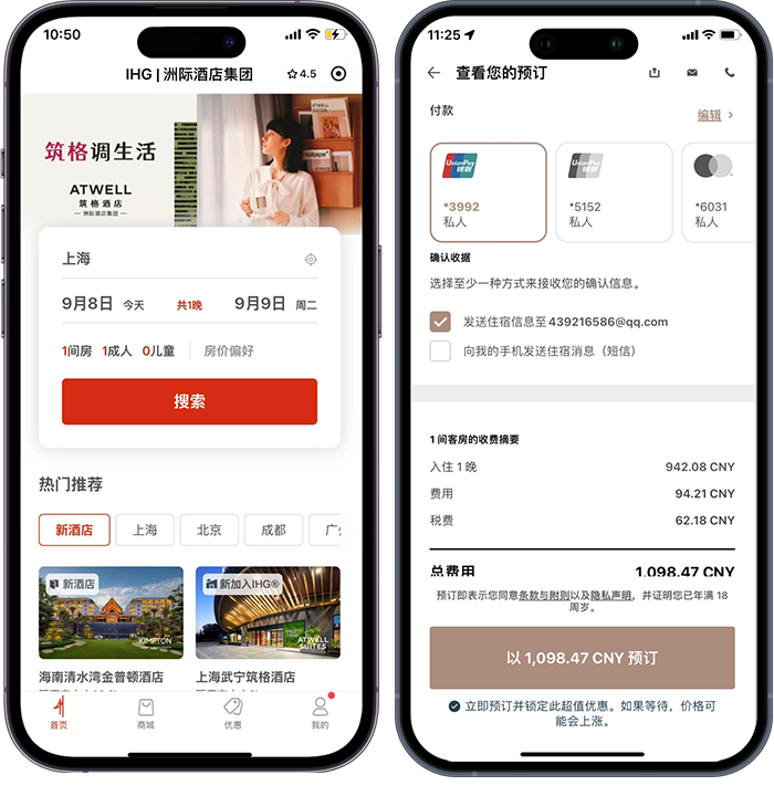 洲際優悅會小程序界面(左)IHG銀聯信用卡在線支付解決方案(右)