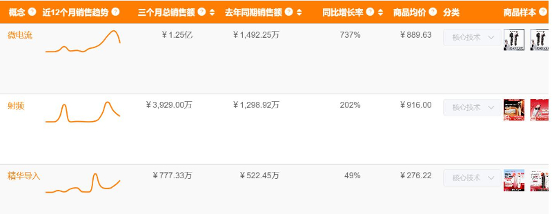 在銷售轉化端,技術價值直接反映為消費買單意愿。射頻、微電流相關產品銷售額均突破千萬元級,微電流類同比激增737%,射頻類同比高增202%。體現出消費者對 “可感知功效” 產品的付費意愿提升,尤其是微電流類的高速增長,暗示 “即時輪廓緊致” 需求正在快速釋放。