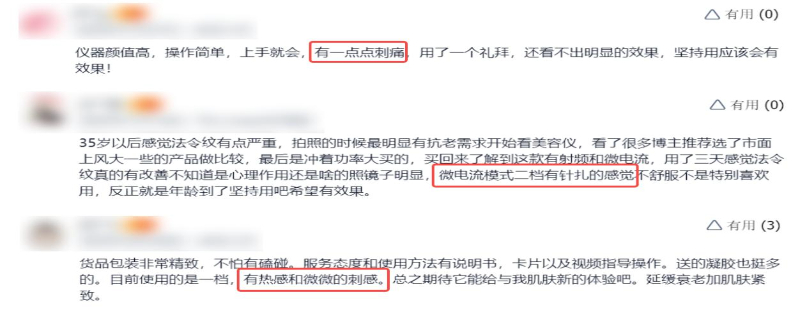 從用戶真實評價可見,膚感問題成為美容儀推廣與留存的突出痛點。部分美容儀操作時會帶來 “刺痛”“針扎感”“微微刺感” 等不適體驗。這類問題不僅降低使用舒適度,還易引發消費者對產品安全性、膚質適配性的顧慮,甚至影響長期使用意愿。